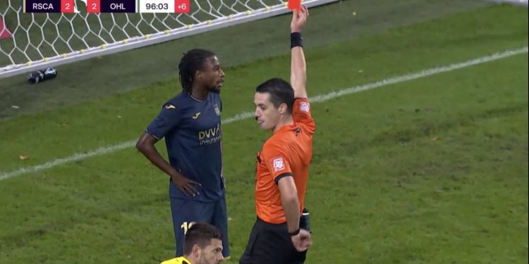 Ghana’s Majeed Ashimeru pulled a leaf out of the Luiz Suarez handbook, when he was sent off for deliberately stopping a goal bound effort with his hand in Anderlecht’s dramatic 2-2 draw with Oud-Hervelee Leuven.
