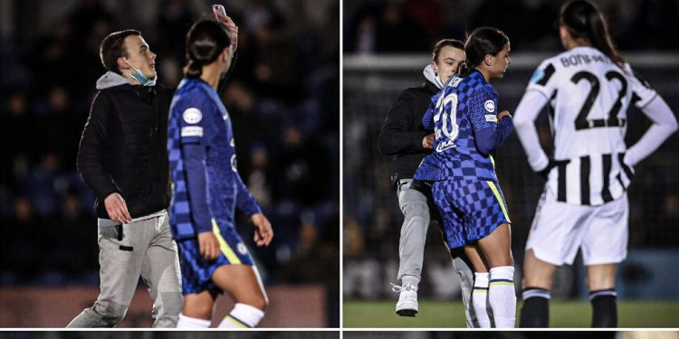 Chelsea’s tight match against Juventus was goalless heading into its closing stages when a man invaded the pitch, interrupting play.